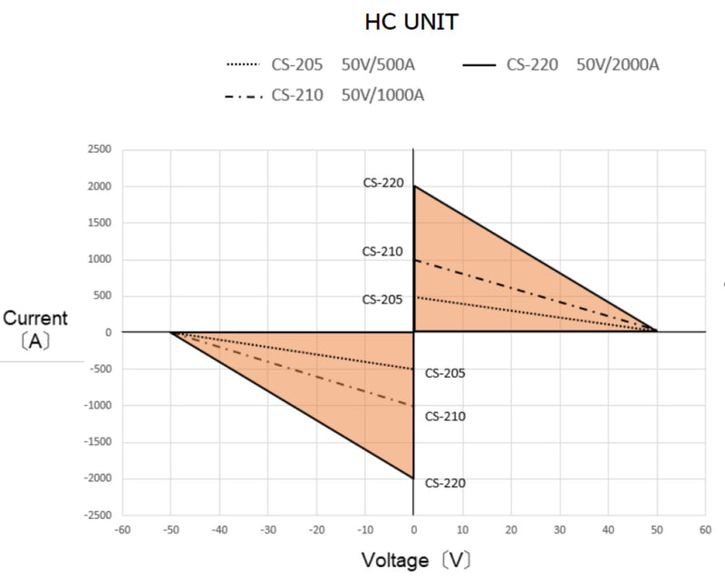 The diagram illustrates the operating ranges of each model. Each HC Unit can apply up to 50 V, with the maximum current capability determined by the model. The plotted areas show the effective voltage–current limits, where the applied voltage reduces the available current accordingly.