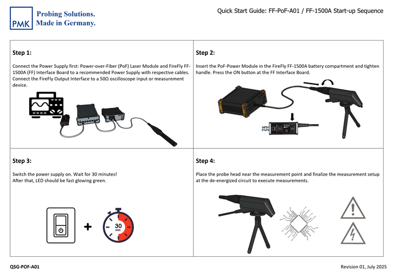 Products included in the illustration below: FireFly® probe, 2.5kV probe tip, Positioner FF-3DPOS200A, 2-channel Power Supply 889-09V-PS2, POF Adapter, IWATSU® oscilloscope DS-8108.