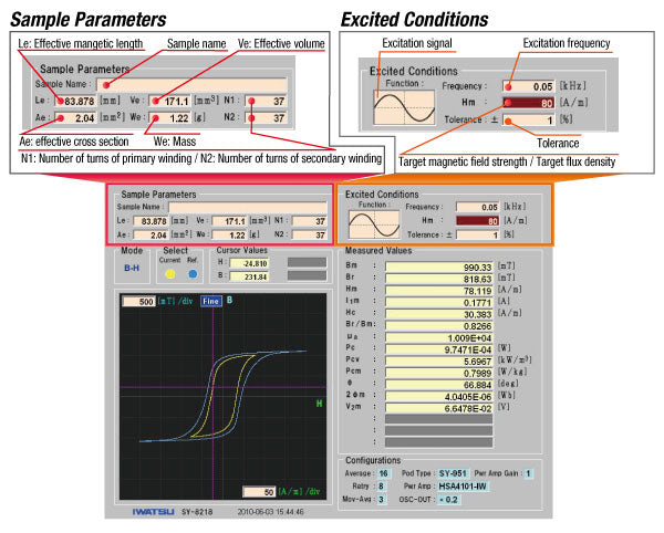 Sample parameters (Effective magnetic length, Effective cross section, number of turns of windings, etc.) and test conditions (Frequency, Maximum field strength: Hm, Maximum flux density: Bm, Maximum induced voltage: V2m, Maximum exciting current: I1m) inputs enable obtaining BH hysteresis curve and magnetic properties in value automatically.